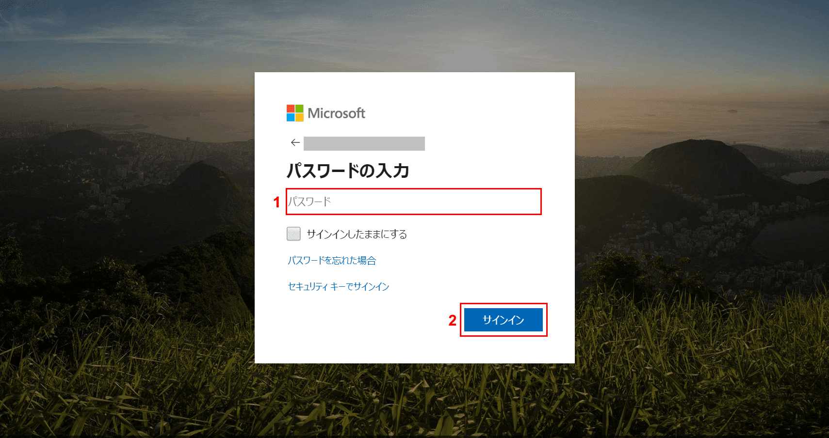 ①入力したアカウントのパスワードを入力し、②【サインイン】ボタンを押します。