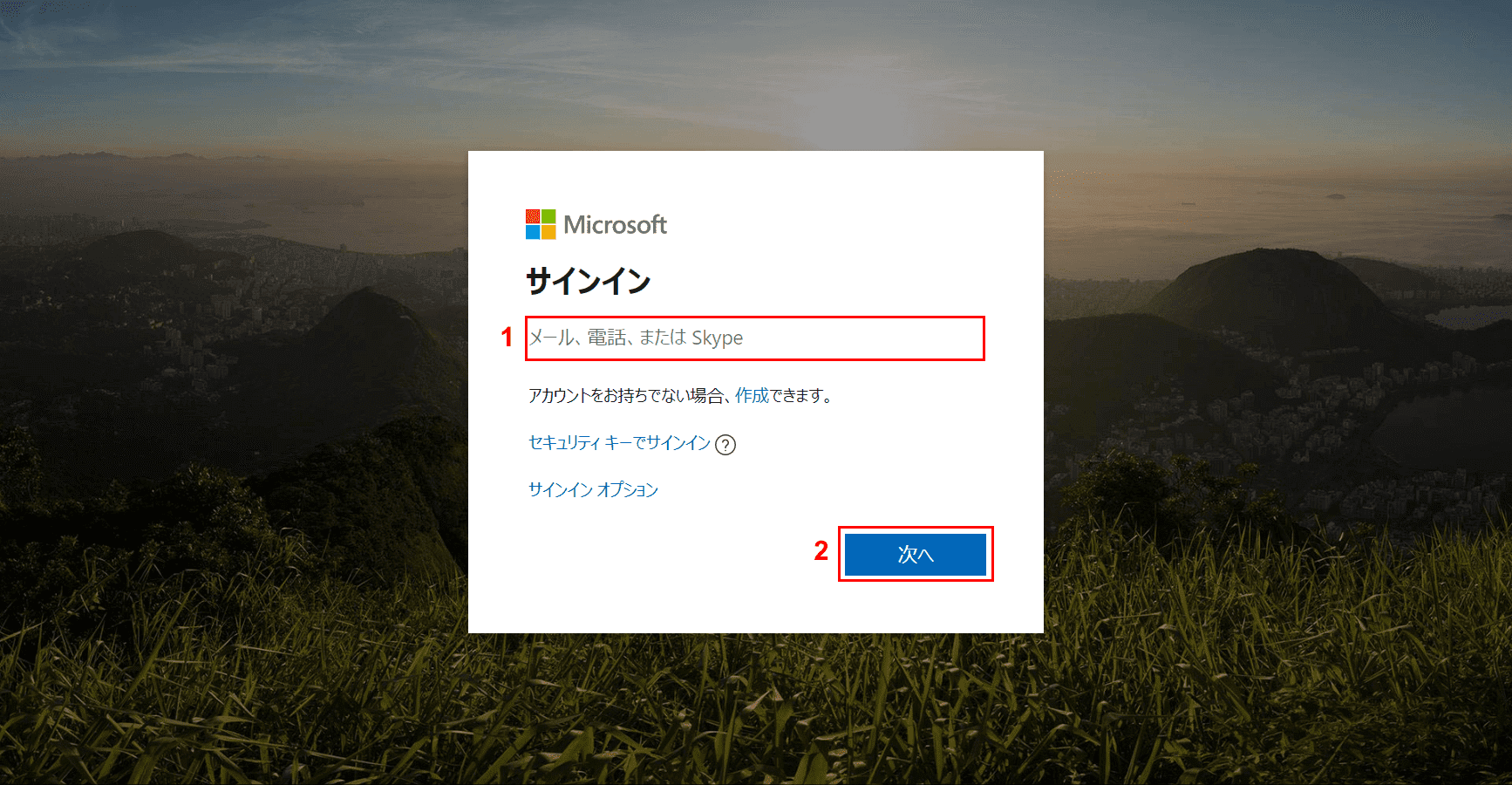 ログイン画面が表示されます。①お使いのアカウントのメールアドレスを入力し、②【次へ】ボタンを押します。