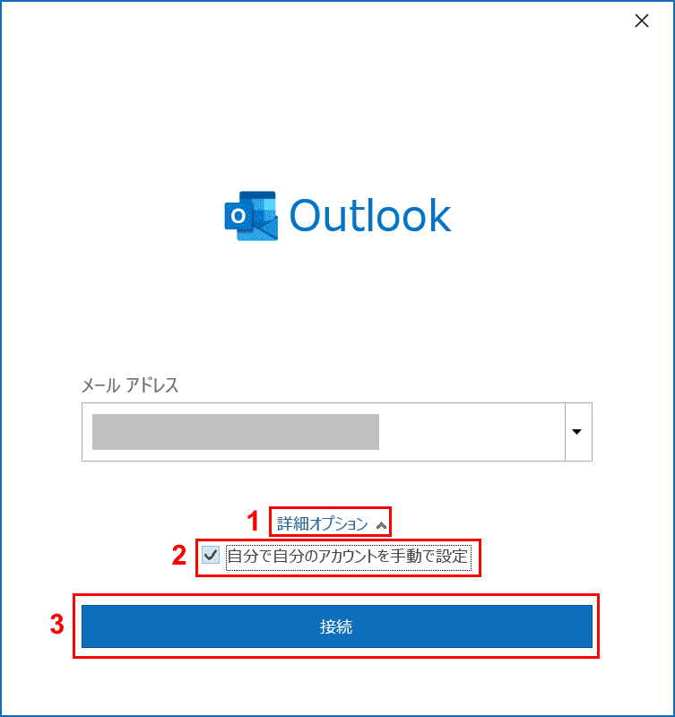 メールアドレスを入力し、①【詳細オプション】を押し、②【自分で自分のアカウントを手動で設定】にチェックし、③【接続】ボタンを押します。