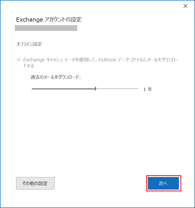 「Exchangeアカウントの設定」ダイアログボックスが表示されます。過去のメールをダウンロードする期間を設定し、【次へ】ボタンを押します。
