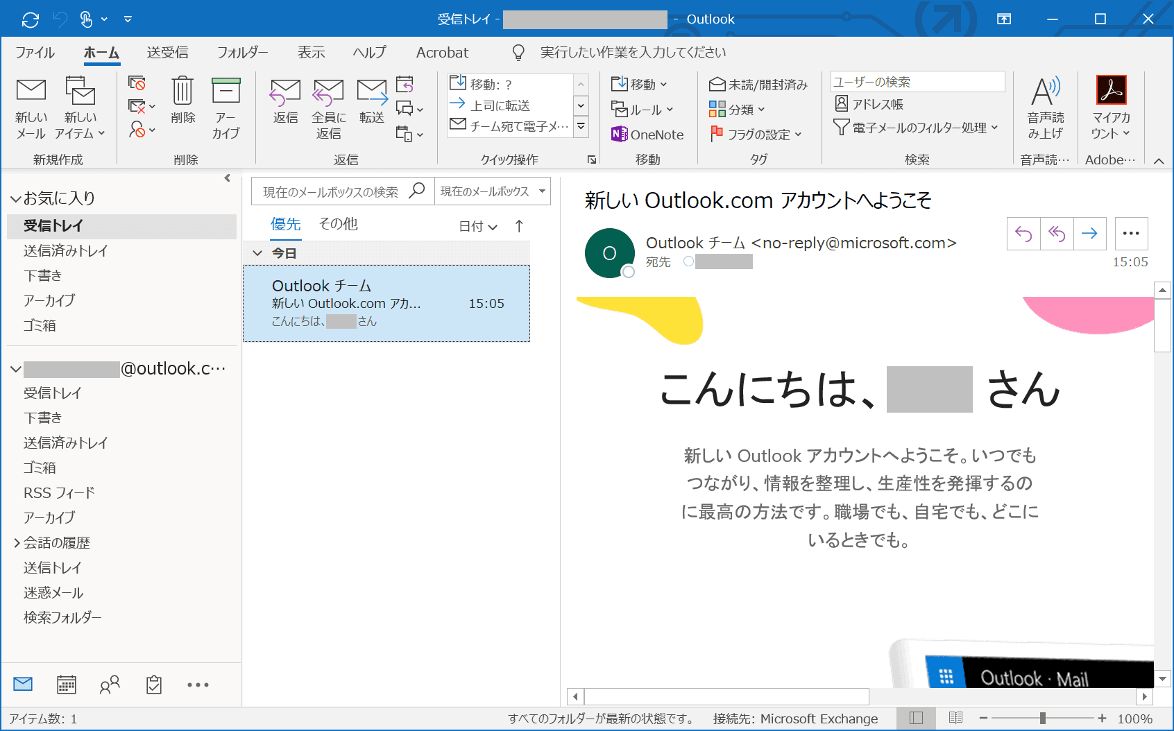 デスクトップ版のOutlookが起動し、画面が表示されました。