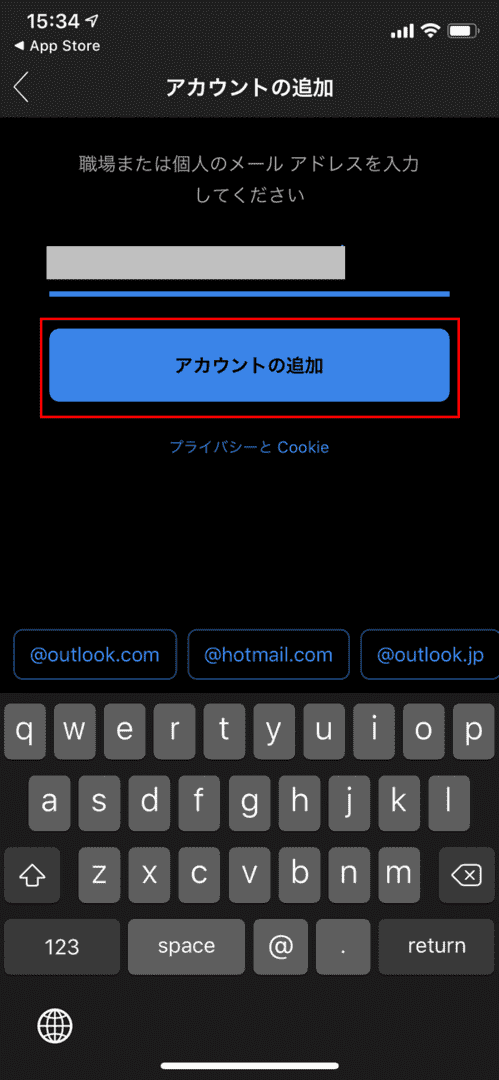 Outlookアプリを開き、Outlook.comアカウントのメールアドレスを入力し、【アカウントの追加】ボタンをタップします。