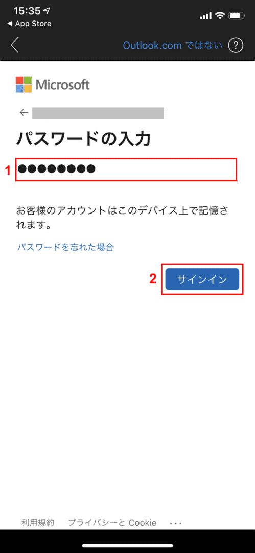 ①Outlook.comアカウントのパスワードを入力し、②【サインイン】ボタンを押します。