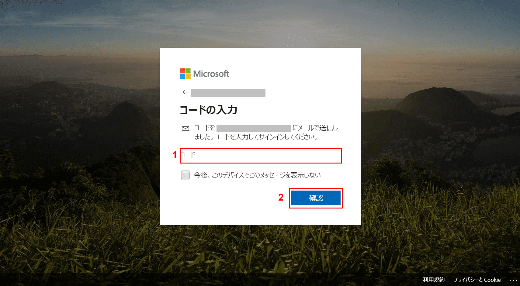 「コードの入力」画面で①コピーしたセキュリティコードをCtrl+Vでペーストし、②【確認】ボタンを押します。
