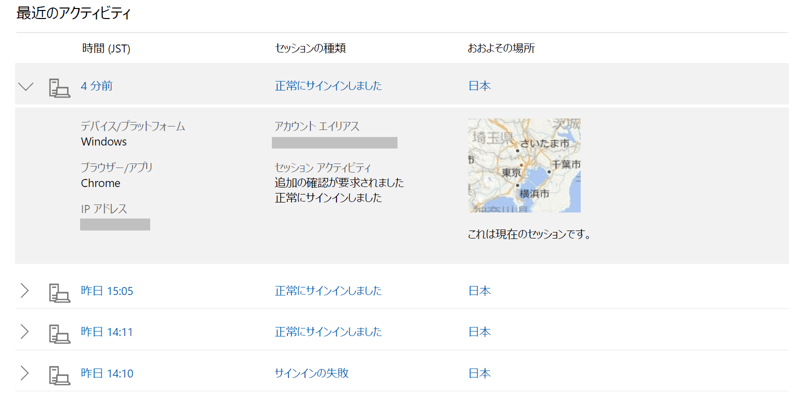 最近のアクティビティ(ログイン履歴)が表示されます。「時間」「セッションの種類」「おおよその場所」を確認できます。